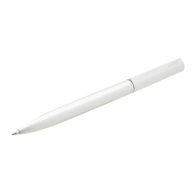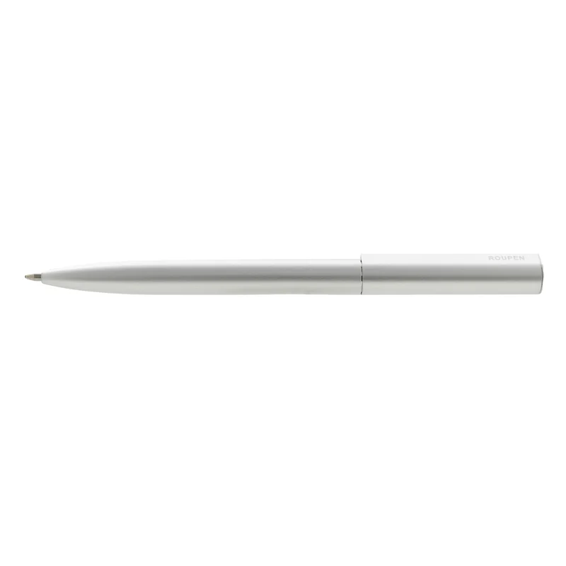 Bolígrafo de cuerpo metálico en aluminio con detalles en negro y plata. Cuenta con tinta azul y apertura con medio giro.