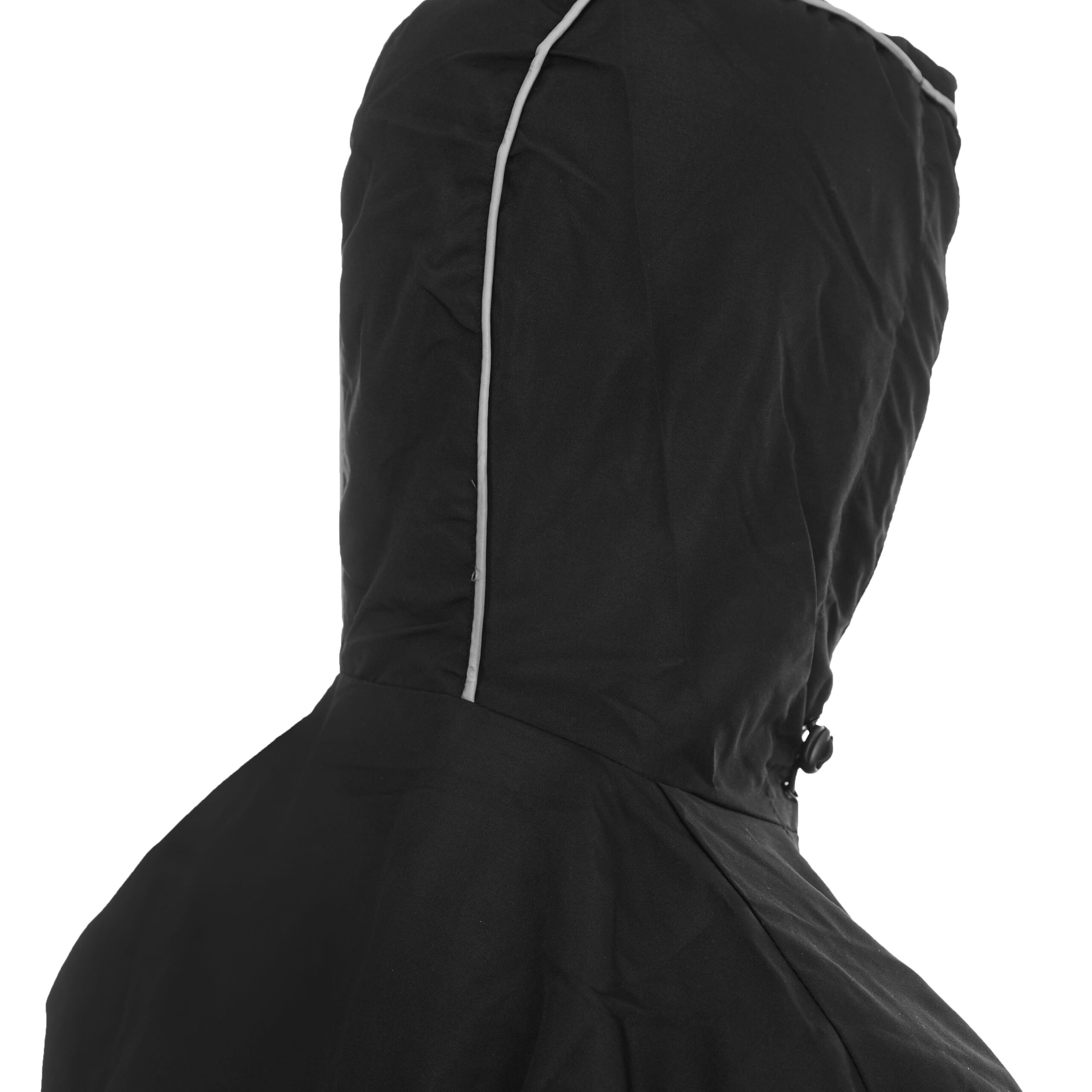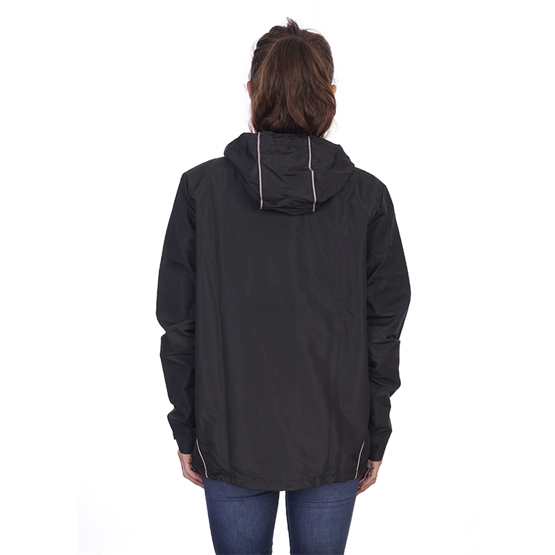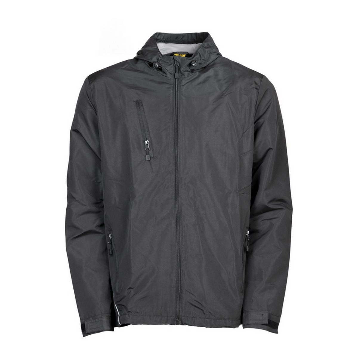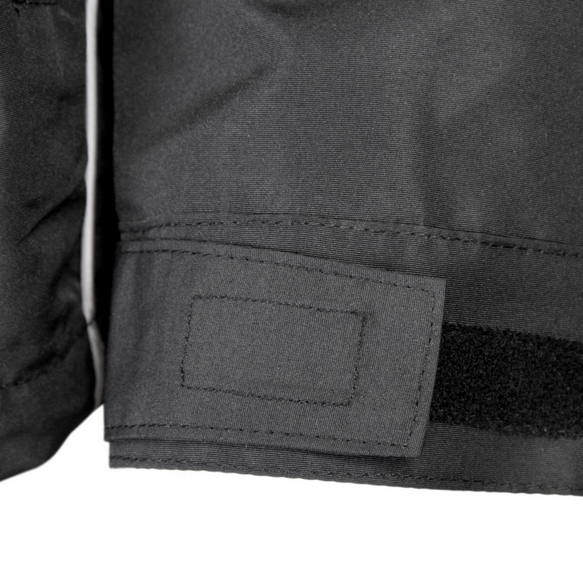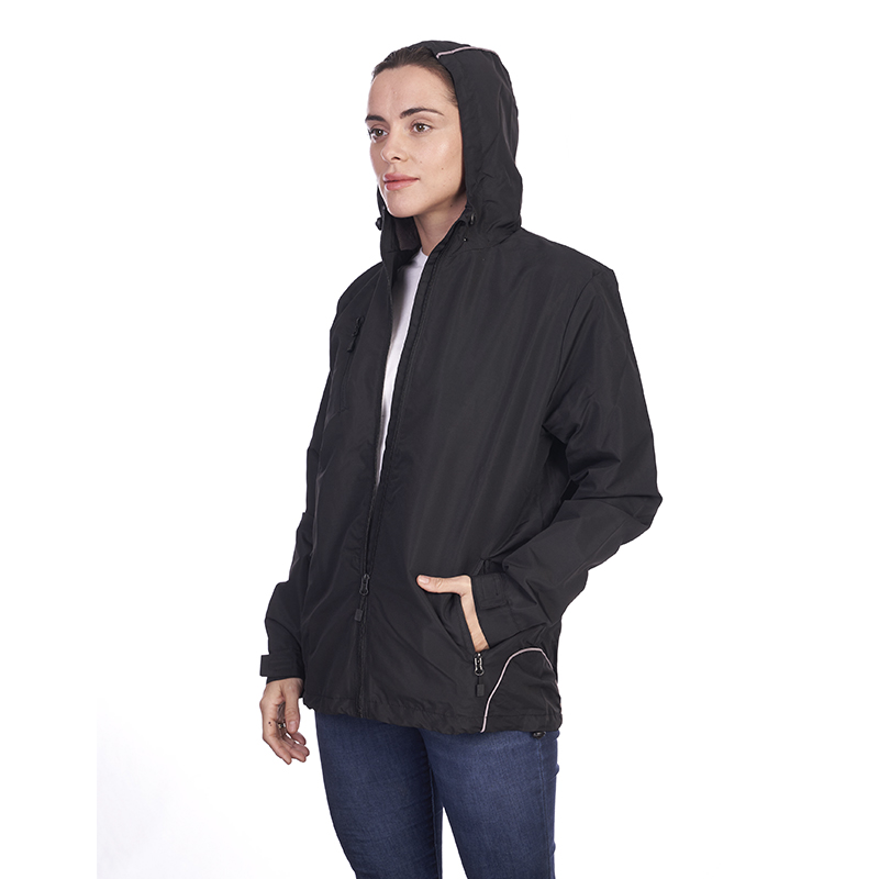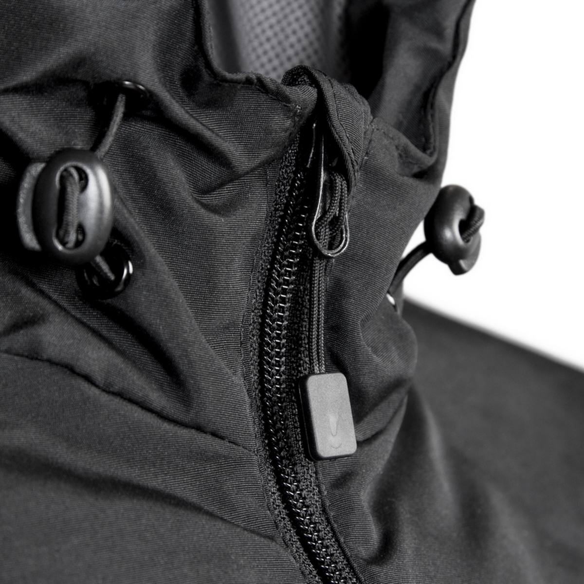 Campera fabricada en Taslan, una tela con recubrimiento impermeable y protección UV. El tejido interior es una malla 100% polyester que permite la ventilación de la prenda. Posee tres Bolsillos con cierre, dos laterales inferiores y uno lateral derecho superior y puños con regulación por velcro. En el extremo superior del cierre, posee una solapa cobertora. Regulación interna en ruedo, por cordón elástico y tanca. Posee capucha con 2 puntos de ajuste y detalles gris reflex.