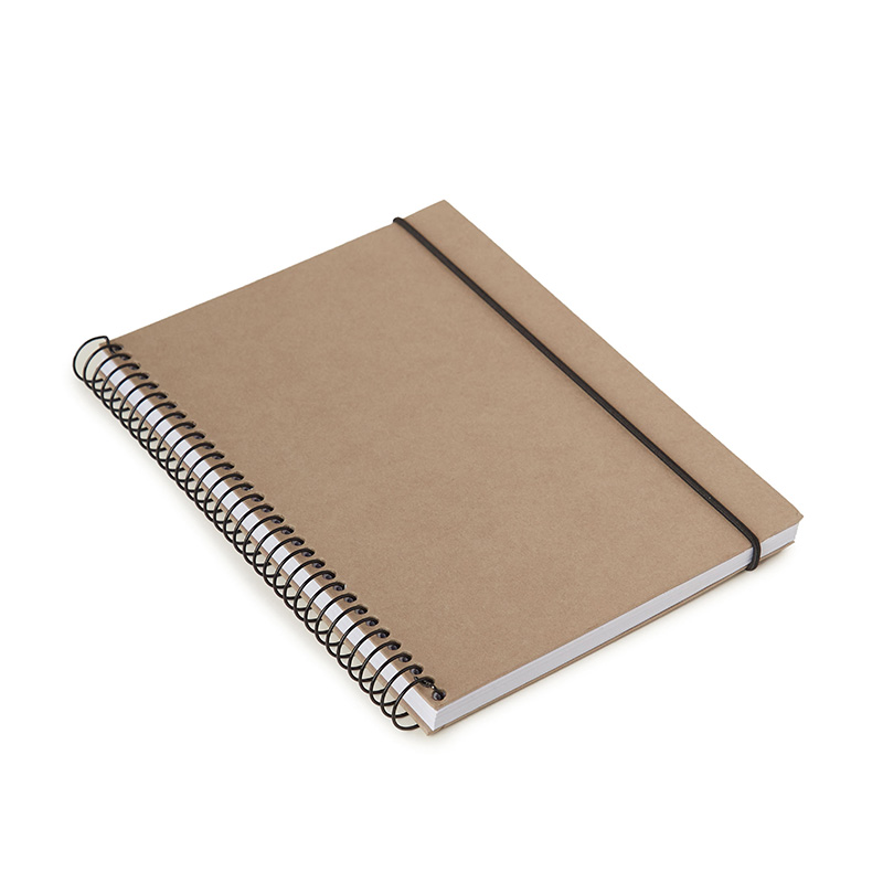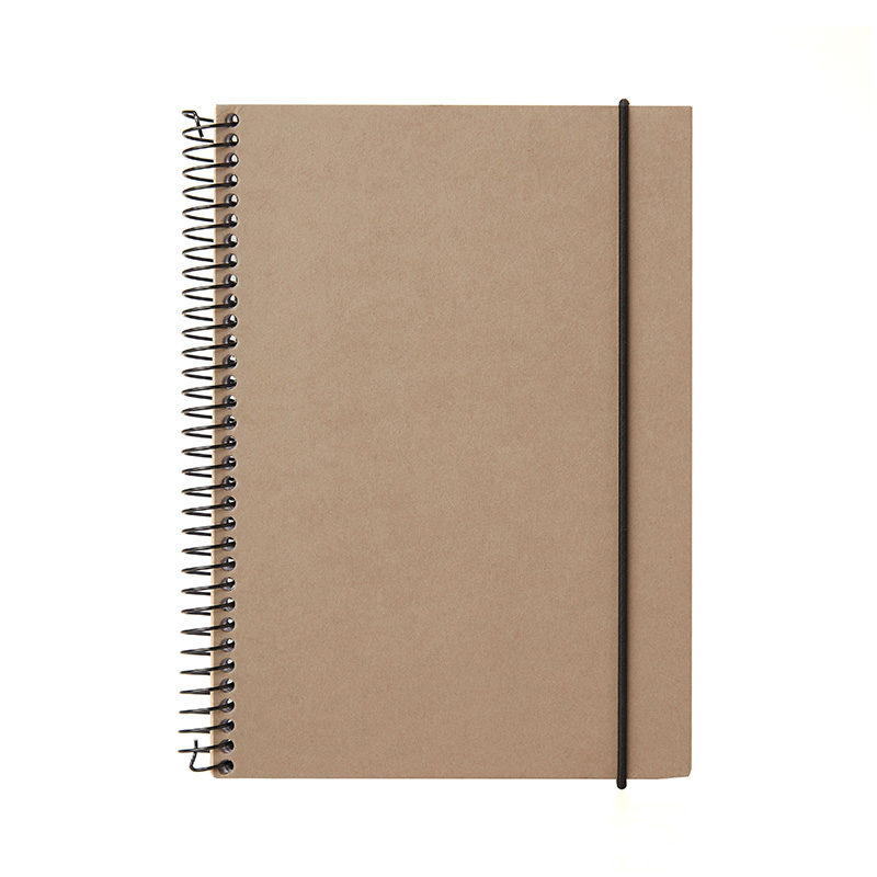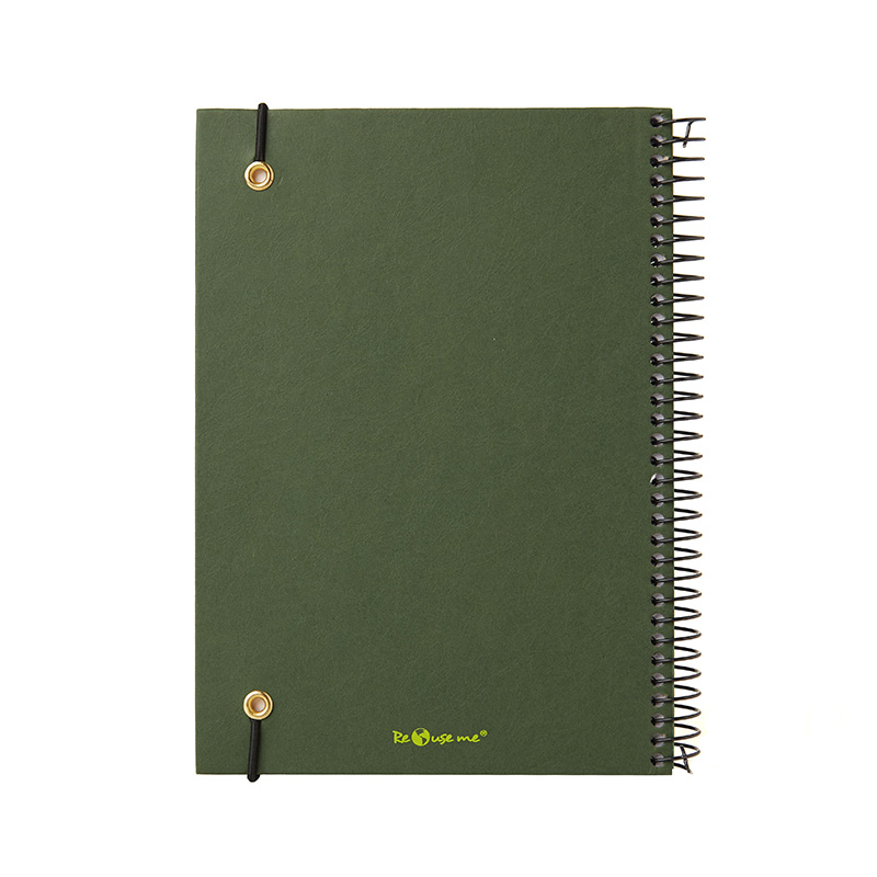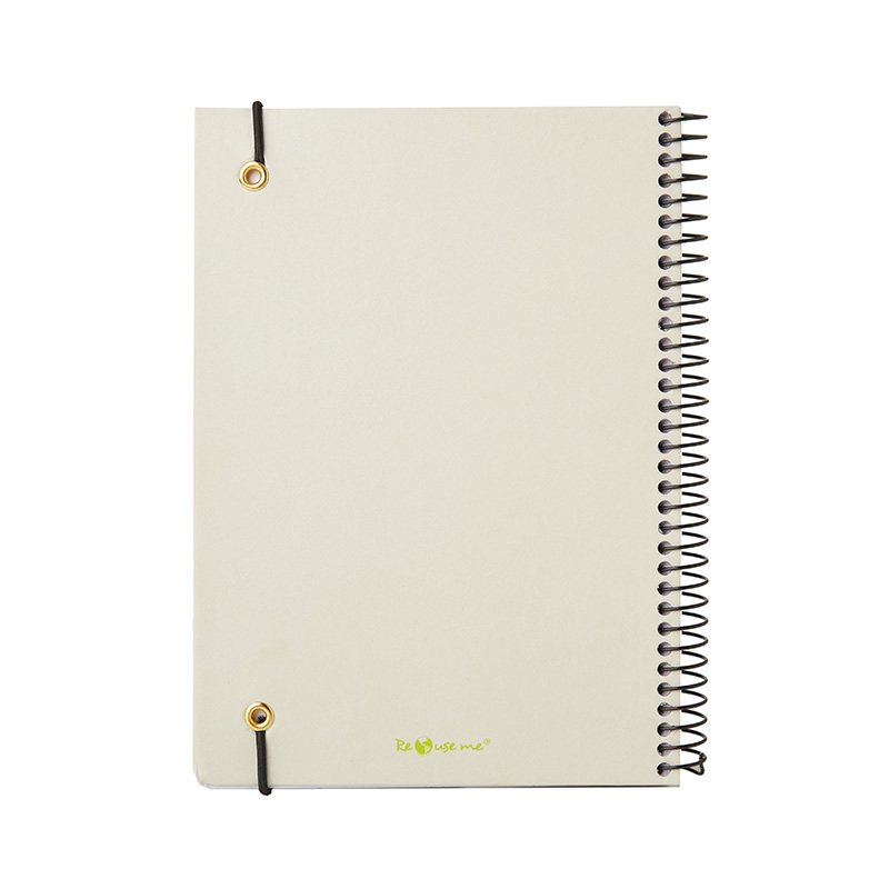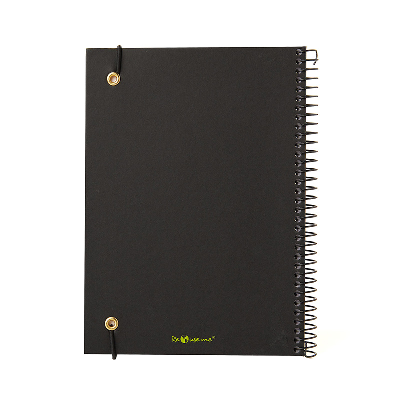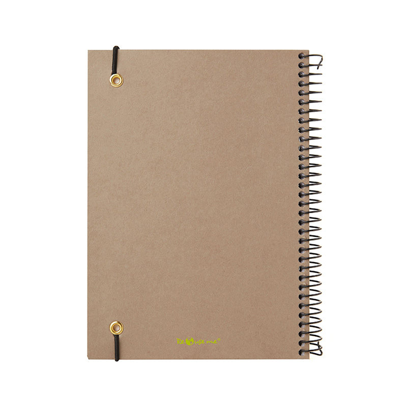 Cuaderno anillado con tapa confeccionado con papel Kraft y 100 hojas lisas de 170 gr. Cuenta con un cierre elástico. Medidas : 14,8 x 21,2 cm. Se presenta protegido en bolsa. ReUseMe.
