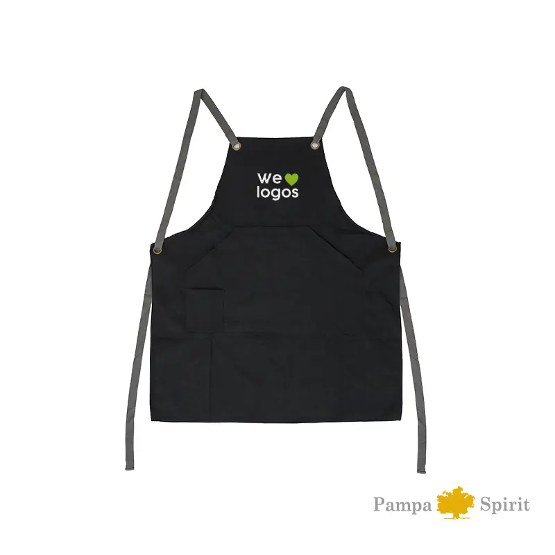 El delantal de Pampa Spirit está confeccionado en tela 50% polyester, 50% algodón. Incluye un bolsillo grande principal y un bolsillo pequeño. Cuenta con dos tiras regulables para atar en la cintura.
