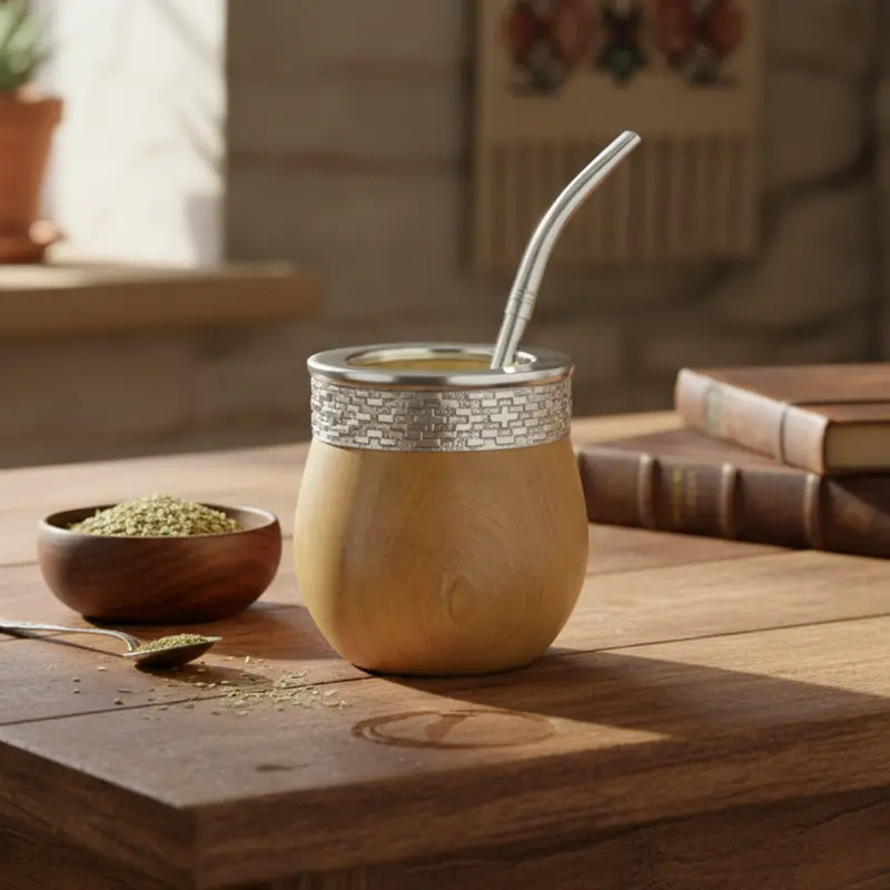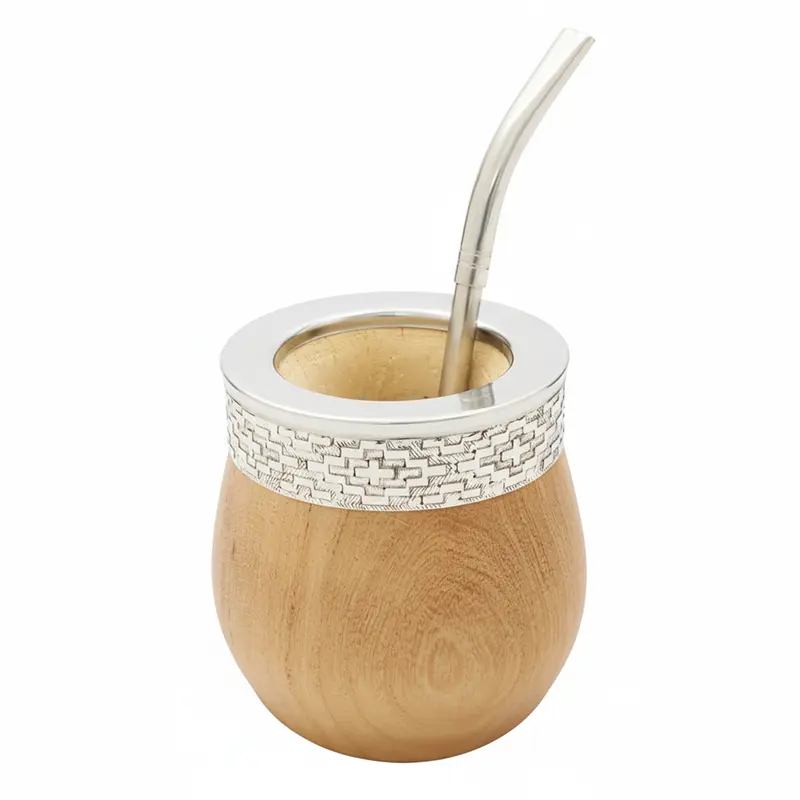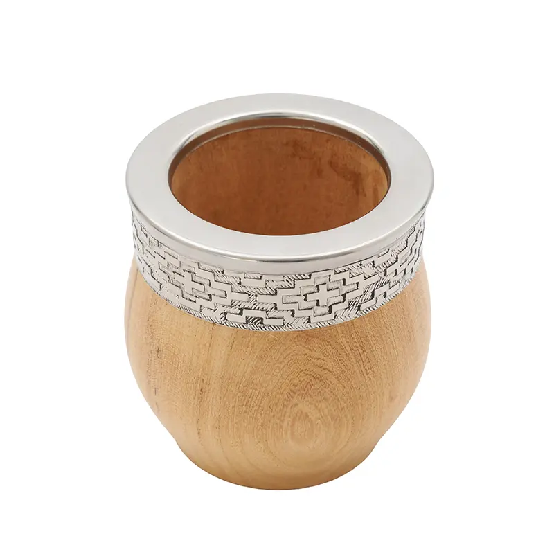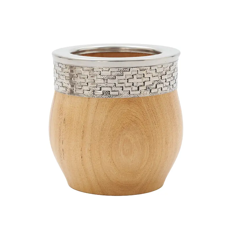 Mate de algarrobo seleccionado pulido con virola imperial de acero inoxidable guarda pampa. Cada pieza puede presentar vetas y nudos que le otorgan un carácter único. Es ideal para quienes desean un mate resistente, elegante y cómodo para el uso diario o para regalar.