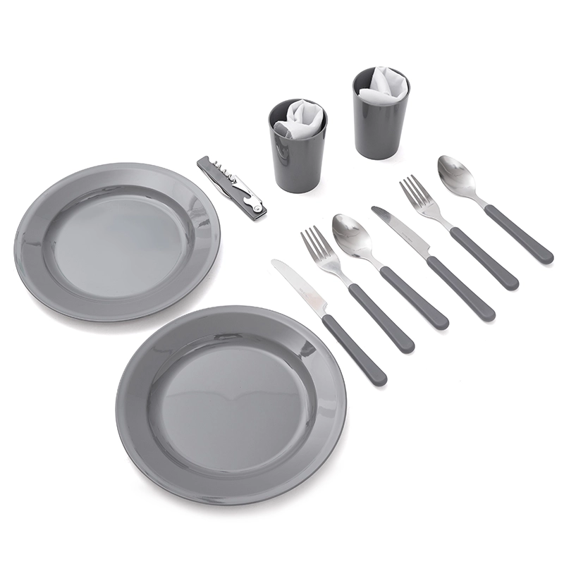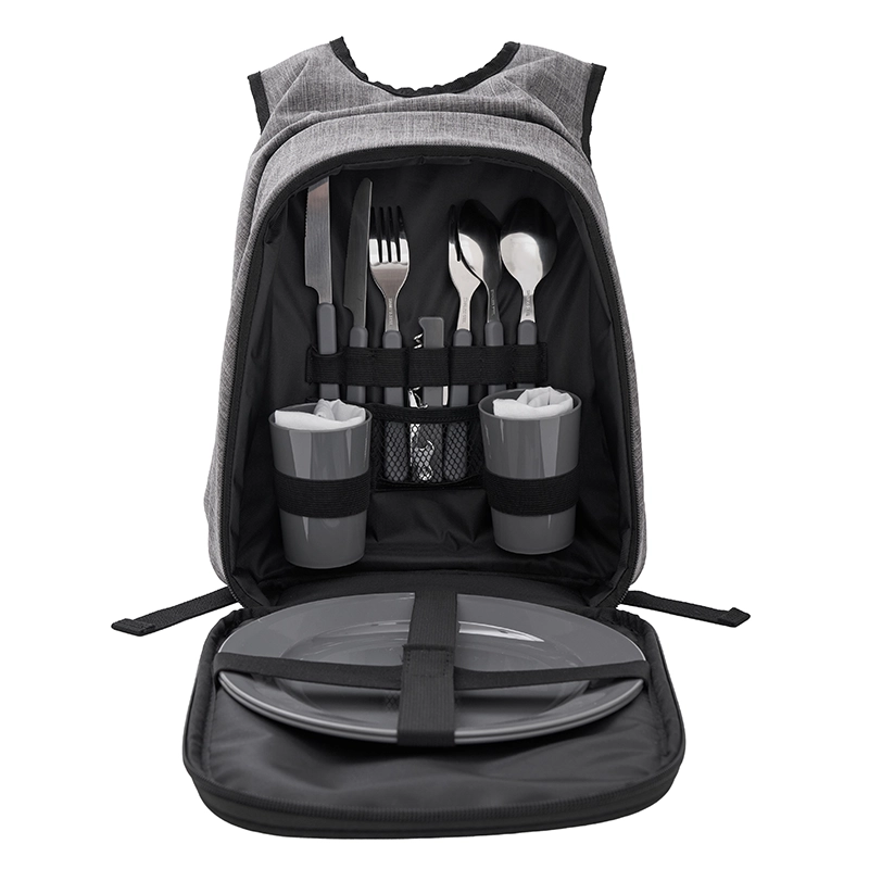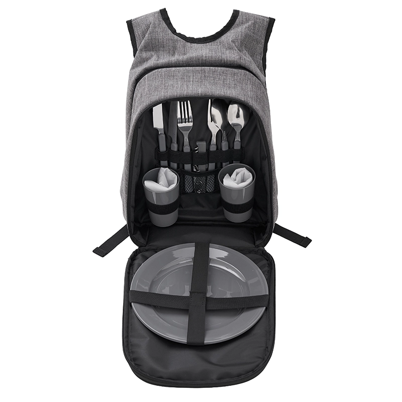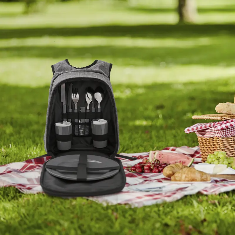 Mochila funcional y moderna para llevar alimentos y bebidas. Fabricada con polycanvas y revestimiento interior térmico de PEVA. Cuenta con compartimento principal amplio para alimentos, compartimento secundario para utensilios o accesorios y correas acolchadas ajustables. Incluye un completo set de picnic con platos, vasos, cubiertos y sacacorcho, todo en el mismo tono. Ideal para picnics, salidas al aire libre, días de campo o viajes, manteniendo todo organizado y fresco.