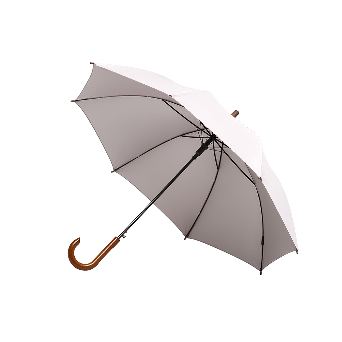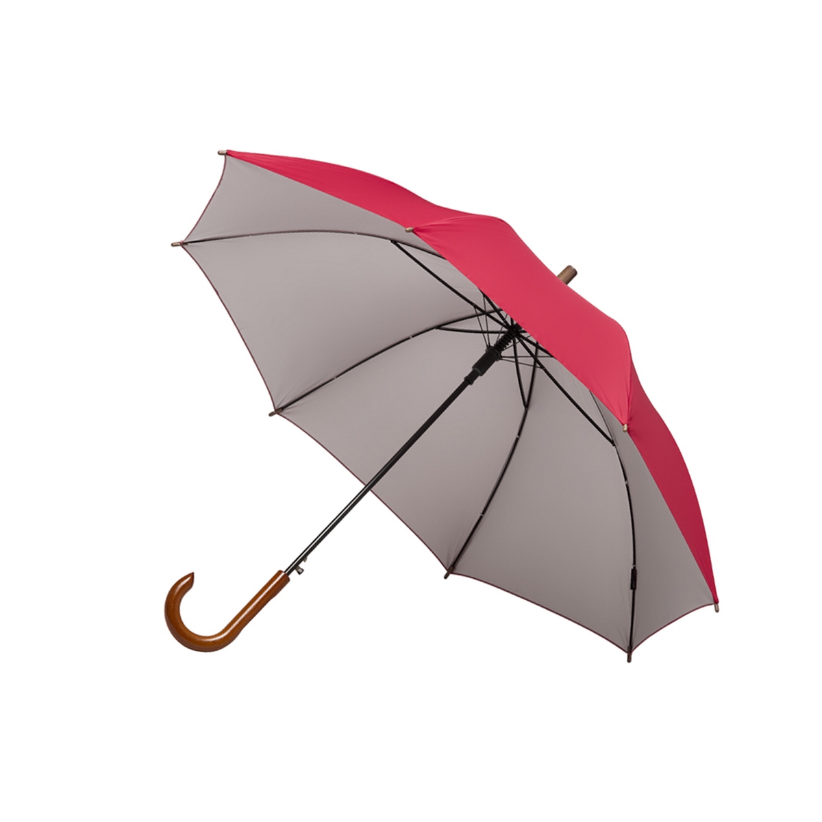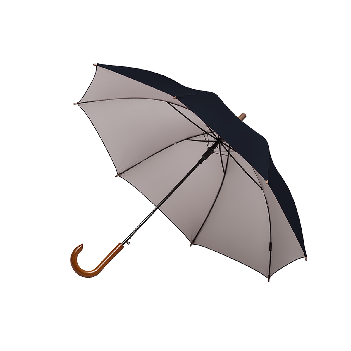 Paraguas street de 8 gajos con mango curvo de madera y estructura metálica negra. Con sistema de apertura automática. Tela de interior silver combinada con exterior en colores. Material: Pongee con interior silver. Medidas: 80 cm x diámetro 105 cm. Tahg.