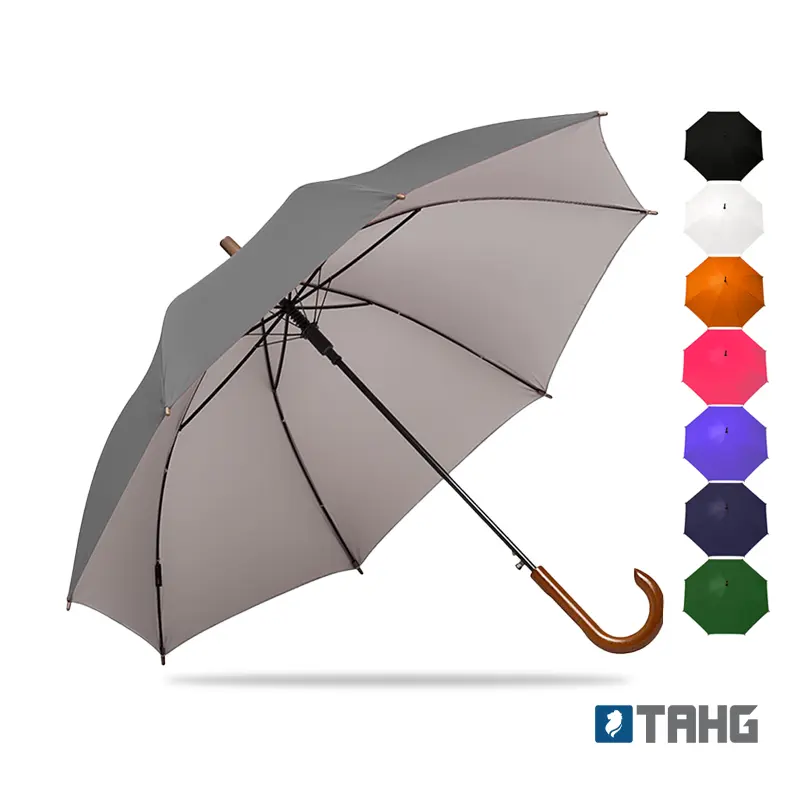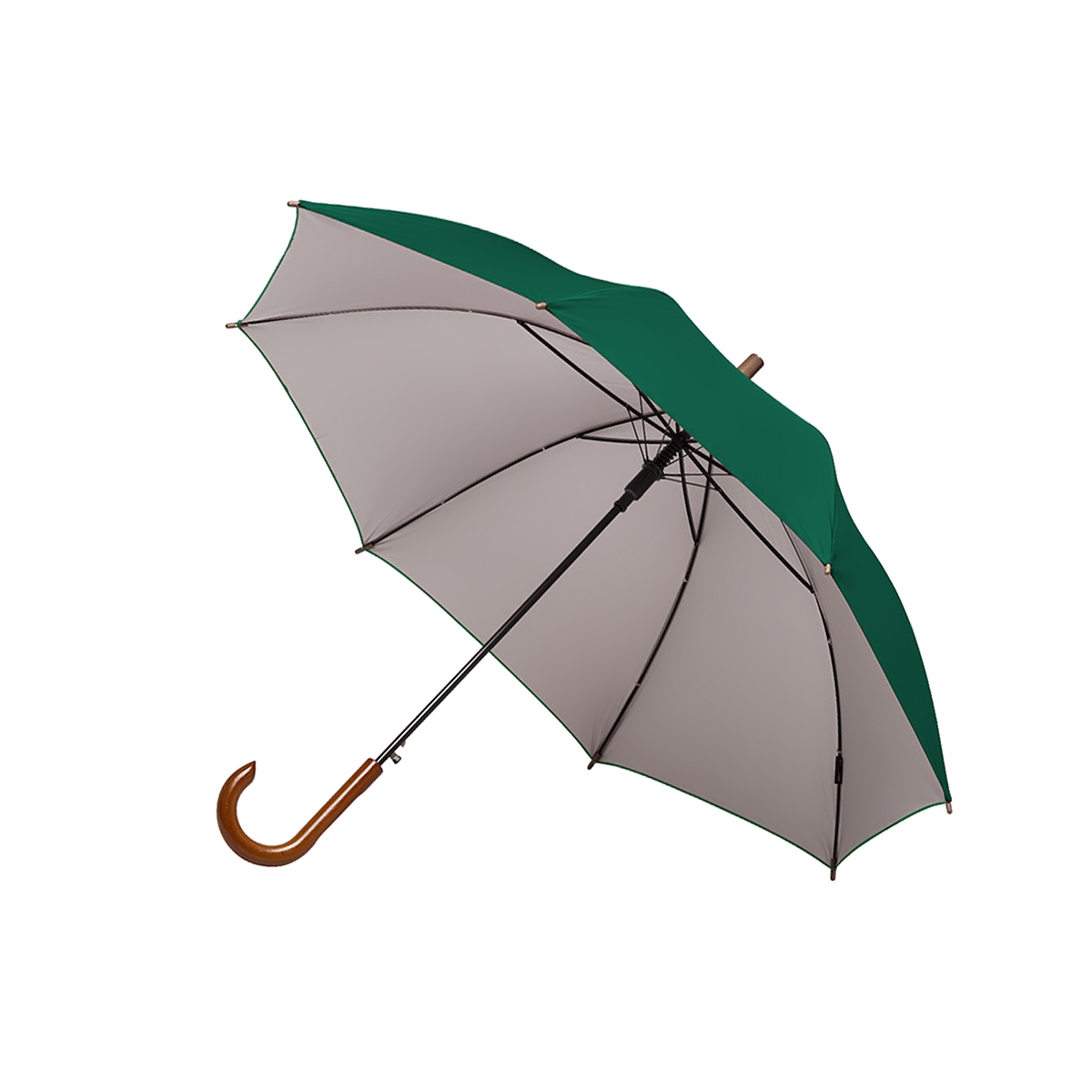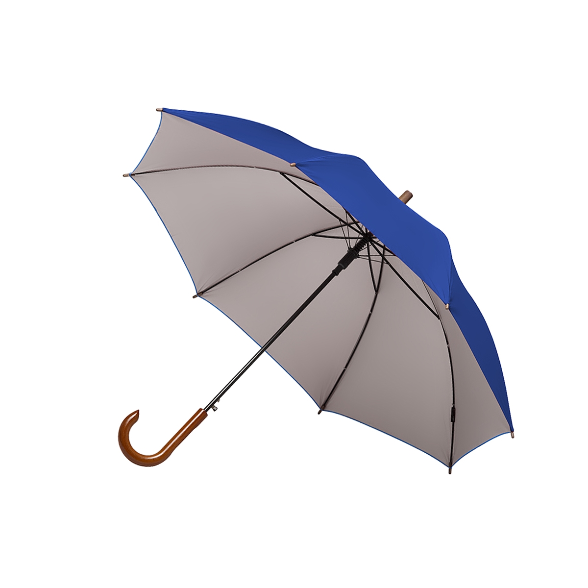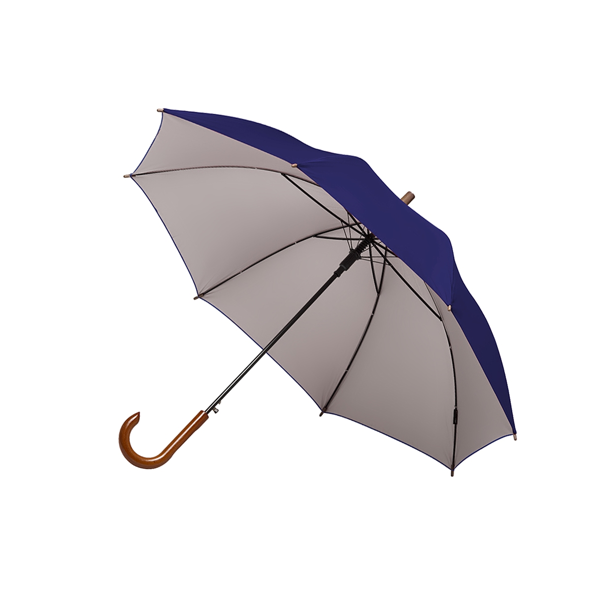 Paraguas street de 8 gajos con mango curvo de madera y estructura metálica negra. Con sistema de apertura automática. Tela de interior silver combinada con exterior en colores. Material: Pongee con interior silver. Medidas: 80 cm x diámetro 105 cm. Tahg.